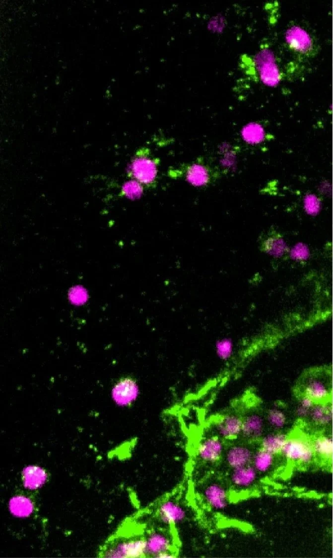 EMT from the HVO (nuclei in magenta, laminin in green)