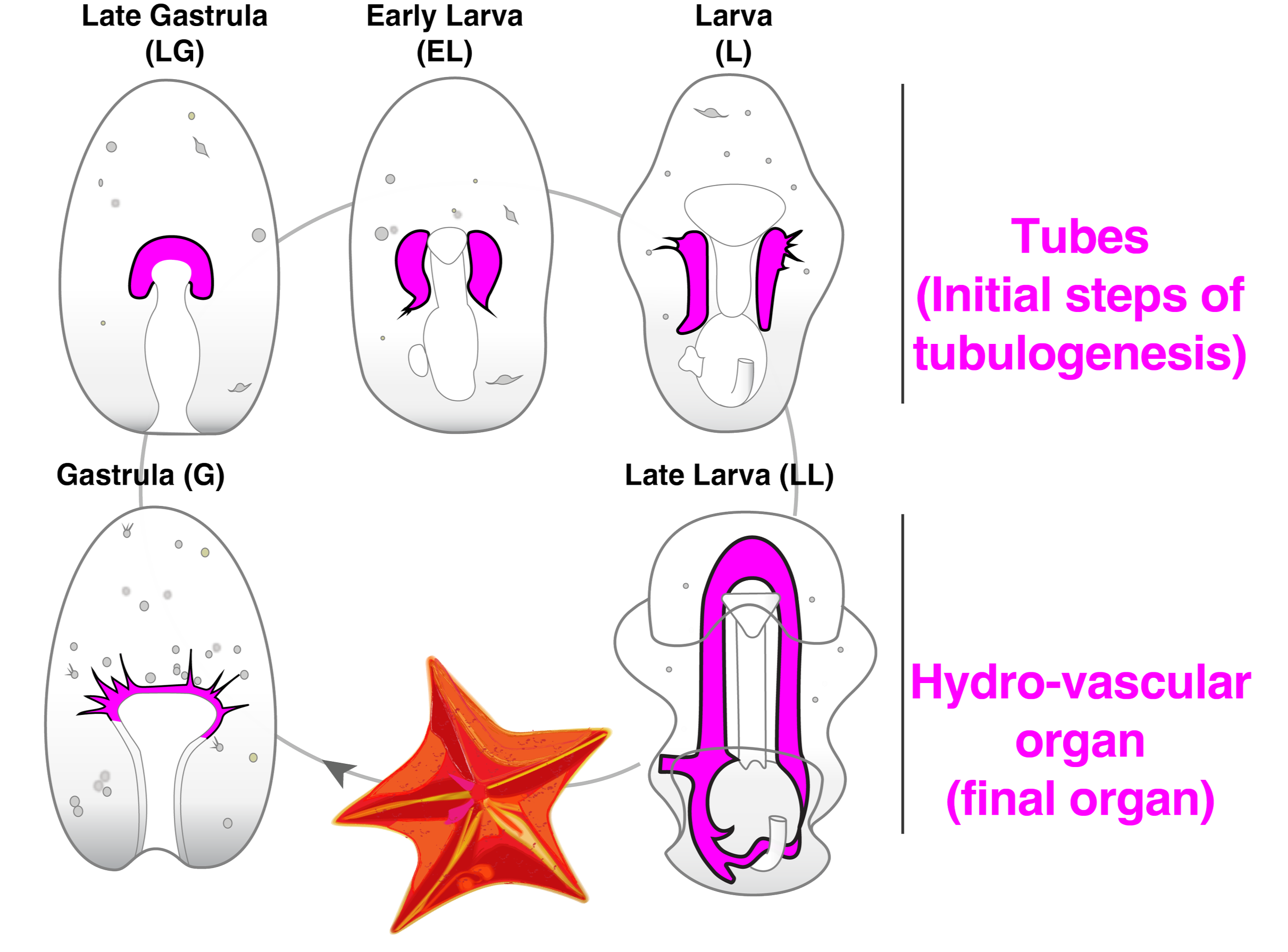 Sea star lifecycle, Hydro-vascular organ in magenta.